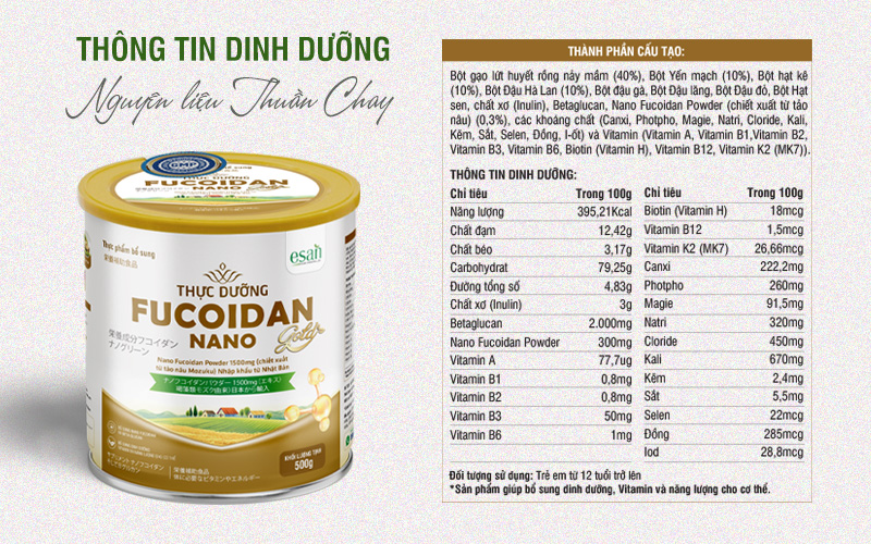 Thực dưỡng Fucoidan Nano Gold là thực phẩm bổ sung dinh dưỡng thuần chay, Kết hợp 8 loại hạt ngũ cốc và nhiều hoạt chất giúp tăng sức đề kháng, mang lại một bữa ăn đầy đủ dinh dưỡng, tốt cho sức khỏe.